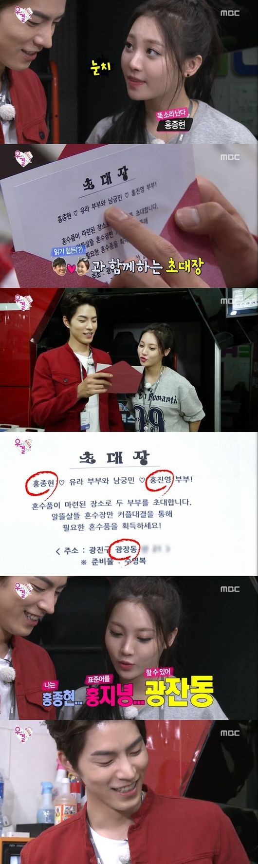 이날 부부는 제작진으로부터 미션 카드를 받았다. 유라는 '홍종현'을 '혼존현'으로 읽으며 제대로 발음을 하지 못했고 홍종현은 "홍종현, 홍진영, 광장동을 다시 (말)해보라"고 부탁했다.