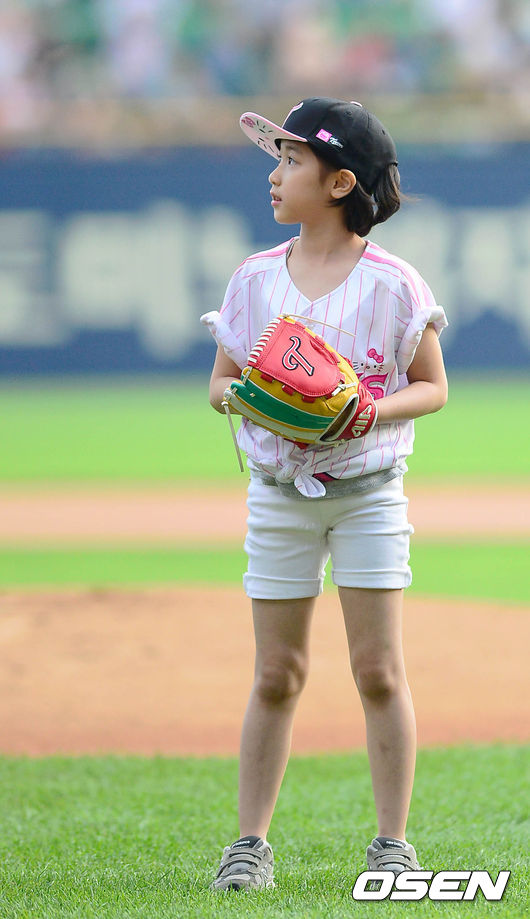 경기에 앞서 진행된 시구에서 아역배우 이레가 시구를 하고 있다.