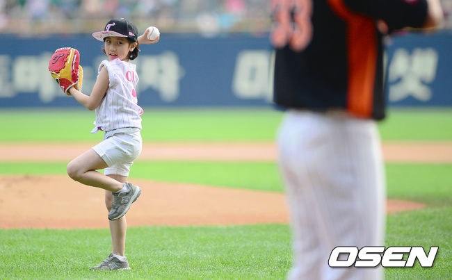 경기에 앞서 진행된 시구에서 아역배우 이레가 시구를 하고 있다.