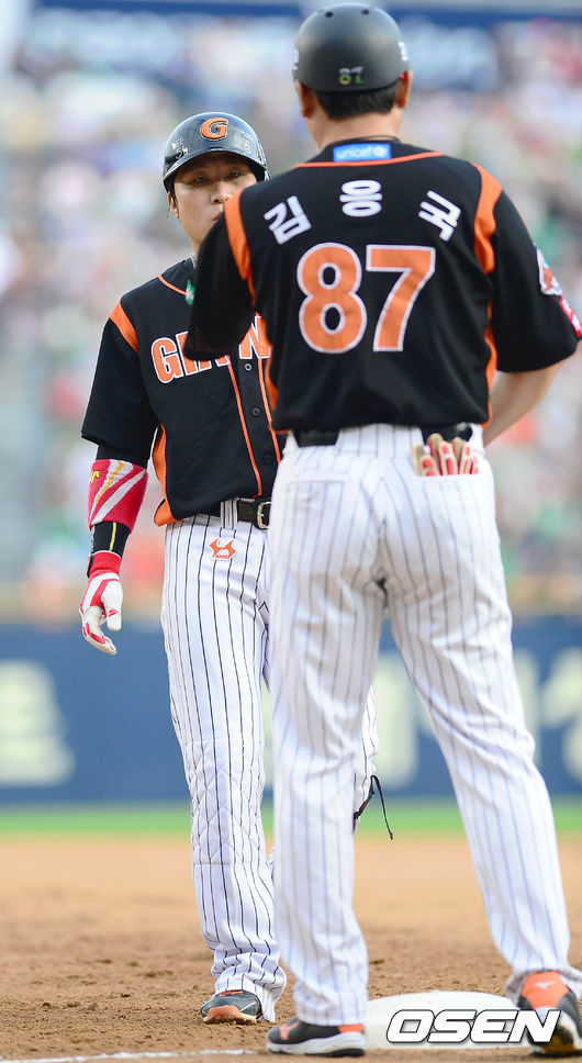 26일 오후 서울 잠실야구장에서 열린 '2014 한국야쿠르트 세븐 프로야구' LG 트윈스와 롯데 자이언츠의 경기,2회초 무사 주자 1,3루, 롯데 용덕한이 1타점 적시타를 치고 1루에 나가 있다.