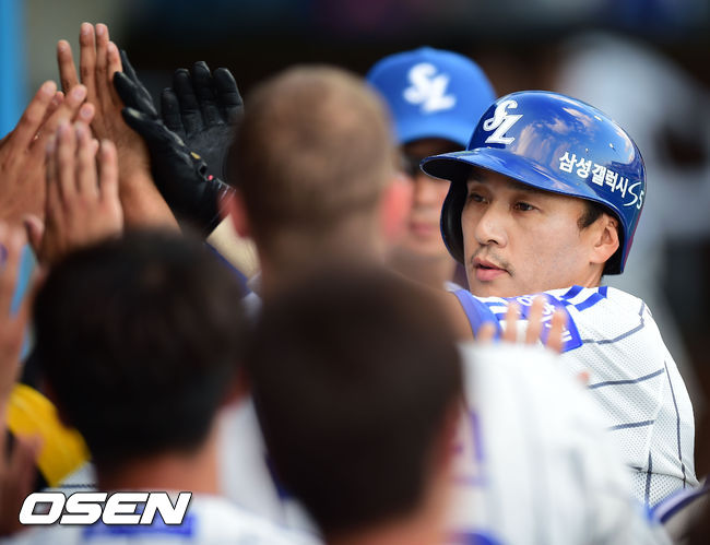 26일 오후 포항 야구장에서 열린 '2014 한국야쿠르트 세븐 프로야구' 삼성 라이온즈와 NC 다이노스의 경기, 2회말 1사 주자 없는 상황에서 삼성 이승엽이 선취 중월 솔로홈런을 날린 후 덕아웃에서 동료들과 하이파이브를 하고 있다.