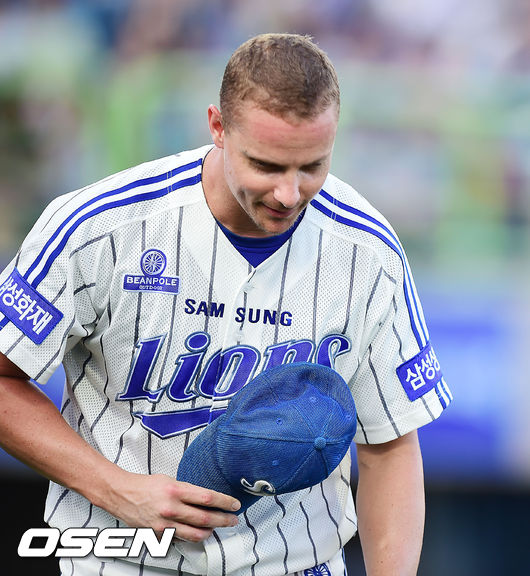 26일 오후 포항 야구장에서 열린 '2014 한국야쿠르트 세븐 프로야구' 삼성 라이온즈와 NC 다이노스의 경기, 3회초를 마친 삼성 마틴이 3회초 1사 NC 김태군의 타구를 라인드라이브 아웃으로 처리한 삼성 1루수 채태인에게 고개 숙여 인사를 하고 있다.