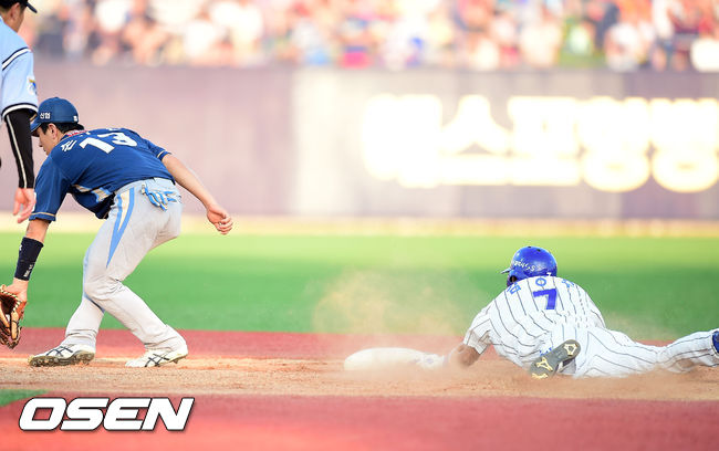 26일 오후 포항 야구장에서 열린 '2014 한국야쿠르트 세븐 프로야구' 삼성 라이온즈와 NC 다이노스의 경기, 3회말 2사 주자 1루 삼성 박해민 타석에서 이루 주자 김상수가 2루 도루에 성공하고 있다.