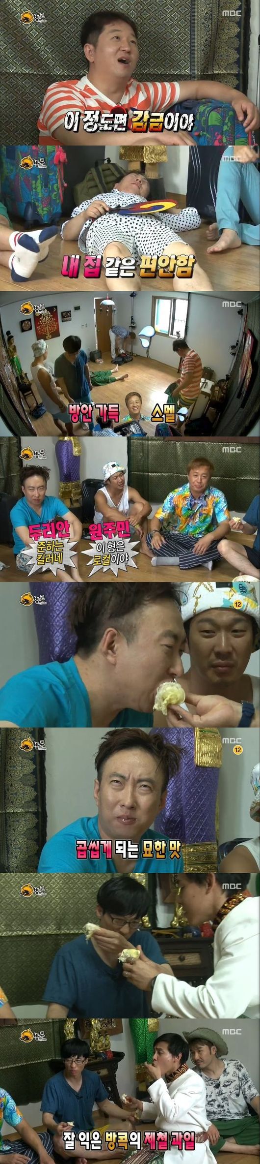숙소에 도착한 멤버들은 이내 방바닥에 누워 쉬기 시작했다. 뭐가 뭔지 알 수 없는 상황에서 태국 가이드가 다시 과일 하나를 들고 도착했다. 멤버들은 두리안을 먹기 시작했다. 정준하는 늘 그렇듯 새로운 과일을 맛있게 잘 먹었고, 정형돈은 냄새로 인해 화장실에 달려갔다.