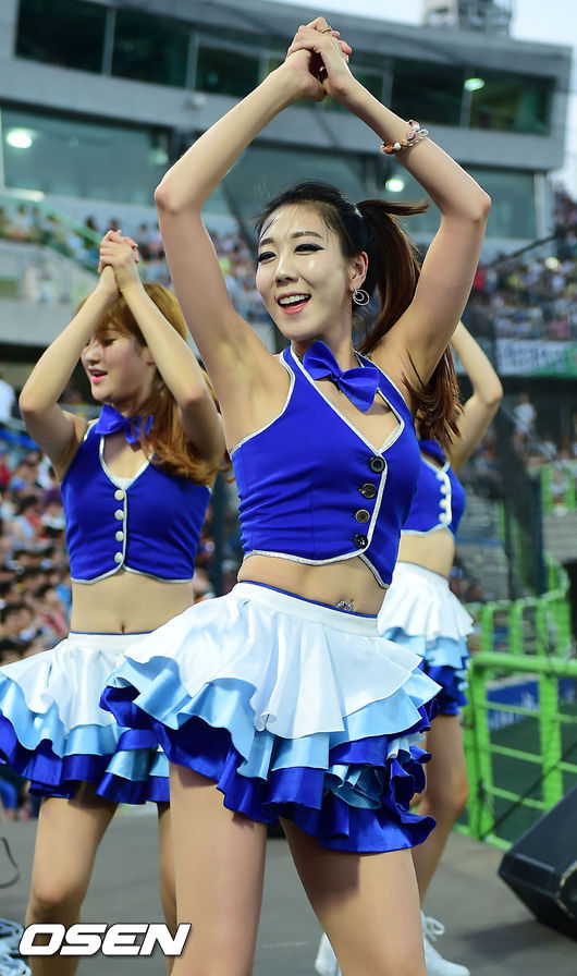 26일 오후 포항 야구장에서 열린 '2014 한국야쿠르트 세븐 프로야구' 삼성 라이온즈와 NC 다이노스의 경기, 삼성 치어리더들이 무대 위에서 화려한 공연을 펼치고 있다.