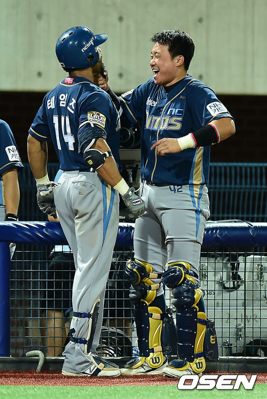 26일 오후 포항 야구장에서 열린 '2014 한국야쿠르트 세븐 프로야구' 삼성 라이온즈와 NC 다이노스의 경기, 7회초 1사 주자 없는 상황에서 NC 테임즈가 우월 솔로 홈런을 날린 후 덕아웃에서 김태군과 수염 세리머니를 하고 있다.