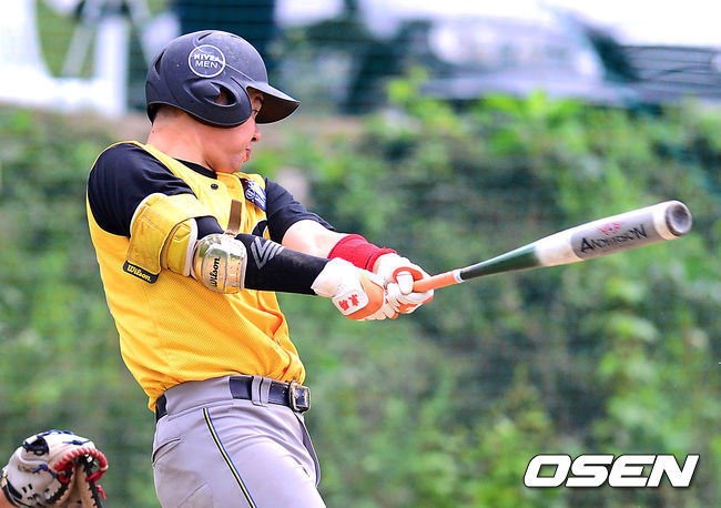 챔피언스 임정훈이 5회말 1사 1루에서 풍산화이터스를 상대로 2점 홈런을 때리고 있다. 아래 사진은 SP 페퍼스 선발 투수 서성환의 투구 모습. /김경섭 기자 greenfield@osen.co.kr