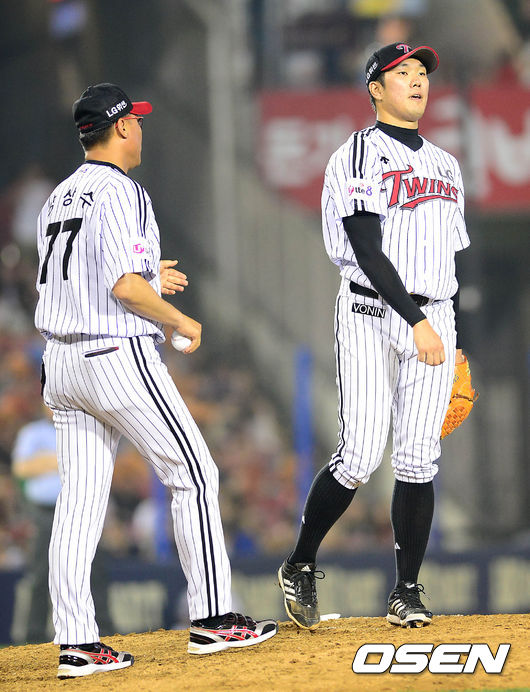 26일 오후 서울 잠실야구장에서 열린 '2014 한국야쿠르트 세븐 프로야구' LG 트윈스와 롯데 자이언츠의 경기, 8회초 2사 이후 LG 유원상이 롯데 전준우에게 안타를 맞고 교체 되어 내려가고 있다.