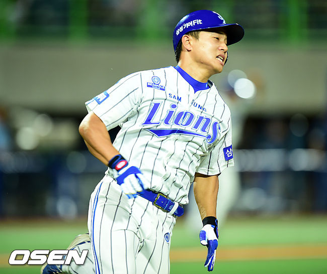 26일 오후 포항 야구장에서 열린 '2014 한국야쿠르트 세븐 프로야구' 삼성 라이온즈와 NC 다이노스의 경기, 8회말 2사 주자 만루 삼성 김헌곤이 좌익수 앞 2타점 적시타를 날린 후 달리고 있다.