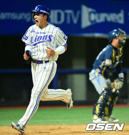 26일 오후 포항 야구장에서 열린 '2014 한국야쿠르트 세븐 프로야구' 삼성 라이온즈와 NC 다이노스의 경기, 8회말 2사 주자 만루 삼성 김헌곤이 좌익수 앞 2타점 적시타때 홈을 밟은 이승엽이 기뻐하고 있다.