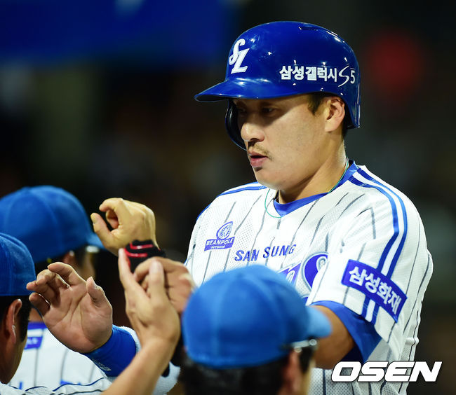 26일 오후 포항 야구장에서 열린 '2014 한국야쿠르트 세븐 프로야구' 삼성 라이온즈와 NC 다이노스의 경기, 8회말 2사 주자 만루 삼성 김헌곤이 좌익수 앞 2타점 적시타대 홈을 밟은 이승엽이 덕아웃에서 동료들과 하이파이브를 하고 있다.