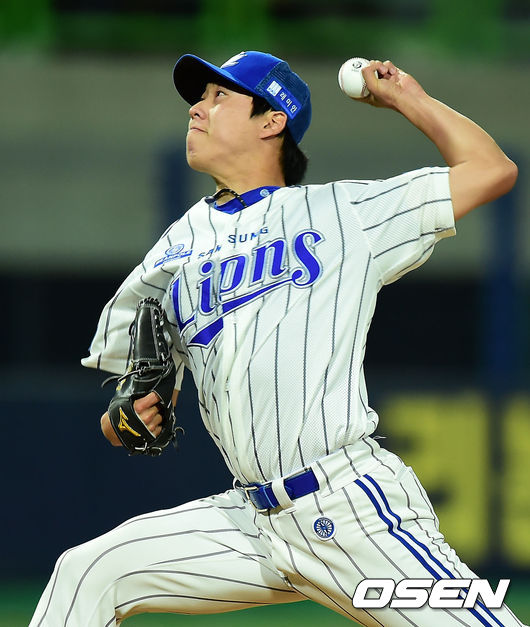 26일 오후 포항 야구장에서 열린 '2014 한국야쿠르트 세븐 프로야구' 삼성 라이온즈와 NC 다이노스의 경기, 9회초 마운드에 오른 삼성 차우찬이 힘차게 공을 뿌리고 있다.