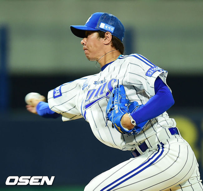 26일 오후 포항 야구장에서 열린 '2014 한국야쿠르트 세븐 프로야구' 삼성 라이온즈와 NC 다이노스의 경기, 9회초 2사 주자 2,3루 마운드에 오른 삼성 임창용이 힘차게 공을 뿌리고 있다.
