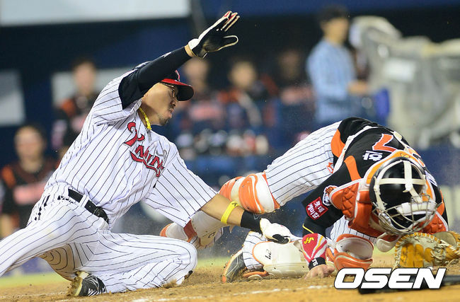 26일 오후 서울 잠실야구장에서 열린 '2014 한국야쿠르트 세븐 프로야구' LG 트윈스와 롯데 자이언츠의 경기, 8회말 1사 주자 1,2루 LG박용택의 안타에 홈으로 쇄도하던 2루 주자 정성훈과 롯데 포수 용덕한이 충돌하여 용덕한이 일어나지 못하고 있다. 정성훈은 세이프 되어 동점이 되었다.