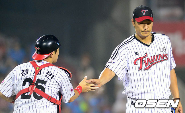 경기종료후 LG이동현과 김재민이 승리의 기쁨을 나누고 있다./greenfield@osen.co.kr