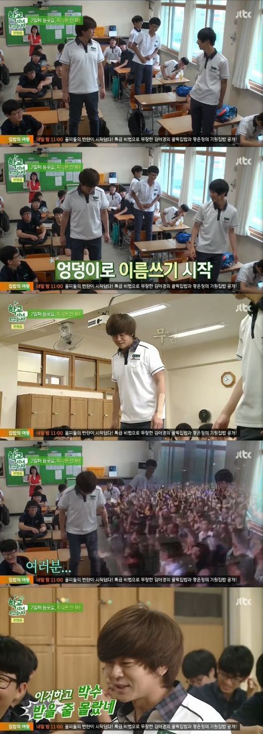 결국 선생님은 지각생 전원에게 의자 위로 올라가라고 명령했고, 모두가 엉덩이로 이름을 쓰는 벌칙을 받았다. 윤도현은 카리스마 있는 로커의 자존심에도 불구, 가차없이 엉덩이를 흔들며 이름을 써 웃음을 줬다.