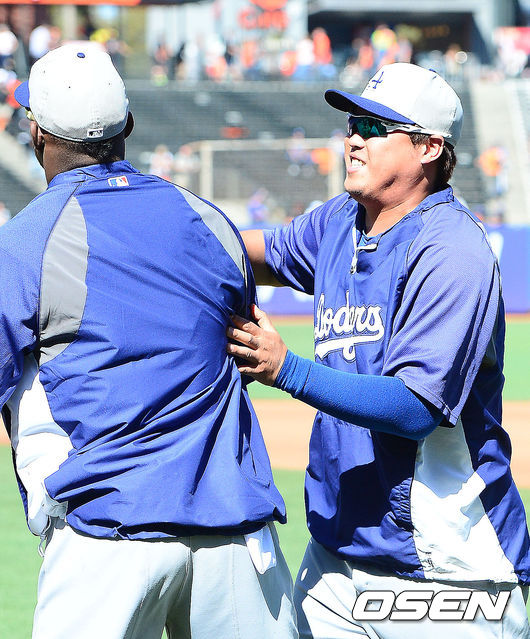 27일(이하 한국시간) 미국 캘리포니아주 샌프란시스코 AT&T 파크에서 열리는 '2014 메이저리그' 샌프란시스코 자이언츠와 LA 다저스의 경기에 앞서 다저스 류현진이 푸이그에게 장난을 치고 있다.
