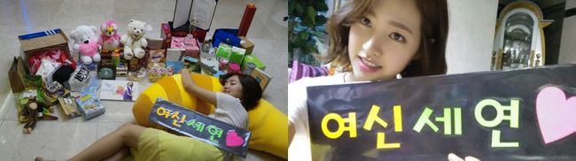 공개된 사진 속 진세연은 팬들이 보낸 선물과 플랜카드를 펼쳐놓고 행복한 모습을 보이고 있다. 특히 ‘여신 세연’이라고 쓰여 있는 플랜카드를 든 진세연은 옅은 메이크업에도 뚜렷한 이목구비와 뽀얀 피부를 자랑해 보는 이들의 시선을 사로잡는다.
