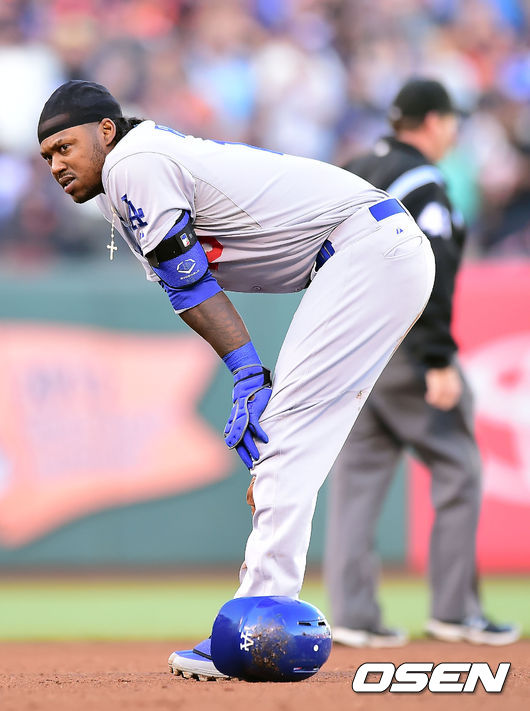 4회초 2사 2루 다저스 라미레즈가 배트가 부러지면서 만들어진 행운의 적시타로 2루까지 진루하려다 아웃당한 뒤 아쉬워하고 있다.