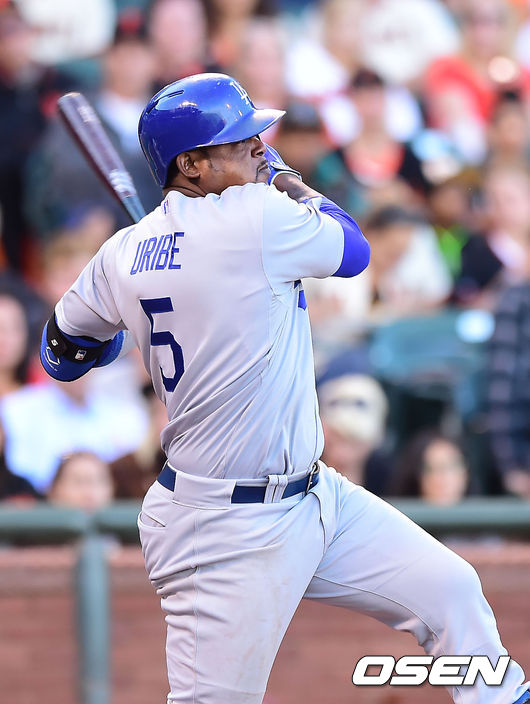 5회초 무사 1,2루 다저스 유리베가 1타점 적시타를 때리고 있다.