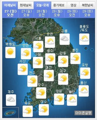 한편 28일에도 전국이 대체로 맑고 무더운 날씨가 이어질 것으로 보인다.