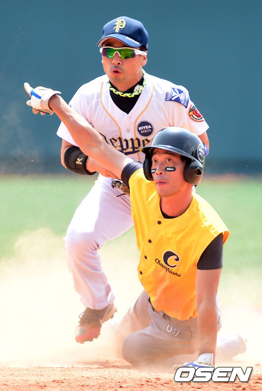 1회말 챔피언스 김해일이 2루 도루를 시도했지만 SP 페퍼스 윤형구에 태그아웃당하고있다.