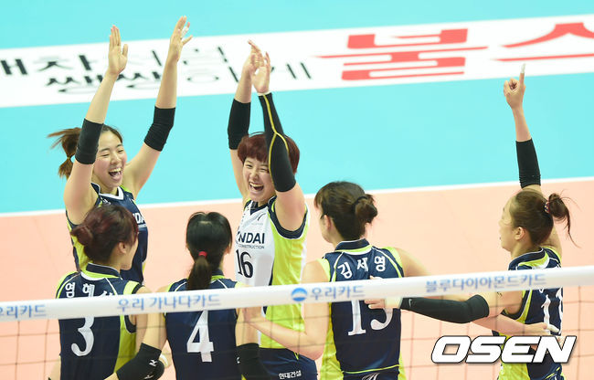 27일 오후 경기도 안산시 상록수체육관에서 진행된 '2014 우리카드컵 프로배구대회'(이하 코보컵) 여자부 결승 현대건설과 GS칼텍스의 경기, 1세트 현대건설 선수들이 득점에 성공하고 기뻐하고 있다.