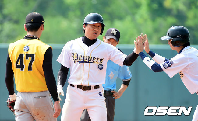 4회초 SP 페퍼스 임경빈이 역전 적시타를 날리고 기뻐하고 있다.