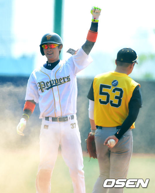 4회초 SP 페퍼스 홍일택이 적시 3루타를 날리고 기뻐하고 있다.