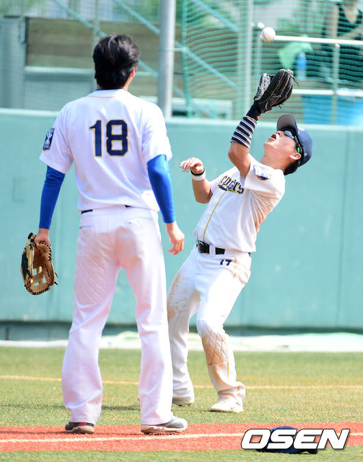 5회말 SP 페퍼스 백기동이 파울플라이 타구를 잡아내고 있다.