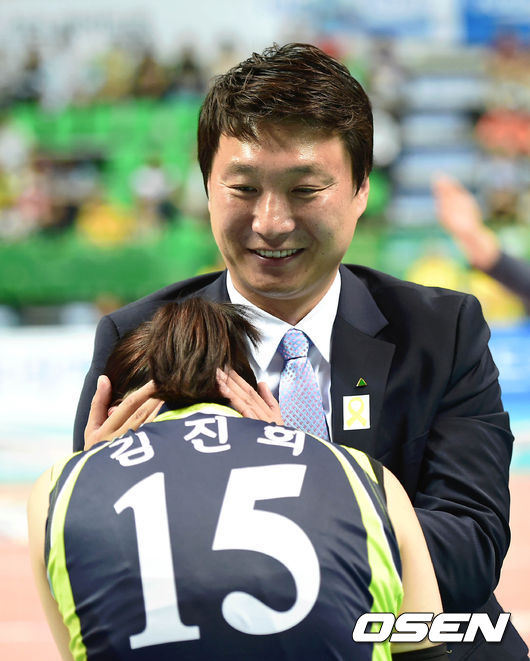 경기종료후 승리한 현대건설 양철호 감독이 김진희와 기쁨을 나누고 있다./greenfield@osen.co.kr