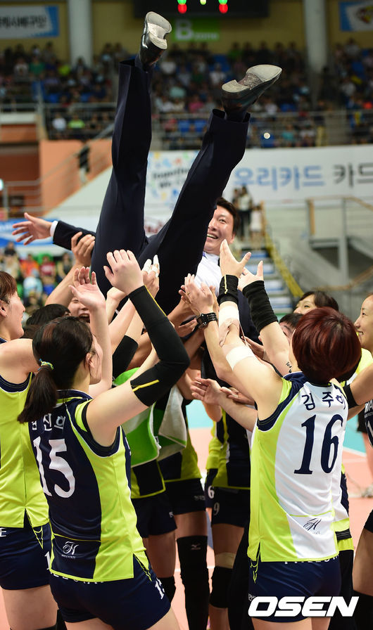 경기종료후 승리한 현대건설 선수들이 양철호 감독을 헹가래 치고 있다./greenfield@osen.co.kr