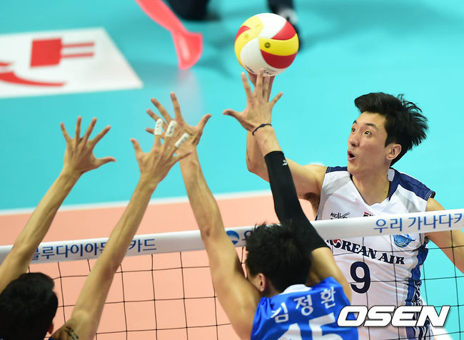 27일 오후 경기도 안산시 상록수체육관에서 진행된 '2014 우리카드컵 프로배구대회'(이하 코보컵) 남자부 결승 대한항공과 우리카드의 경기, 1세트 대한항공 곽승석이 페이크 공격을 하고 있다.