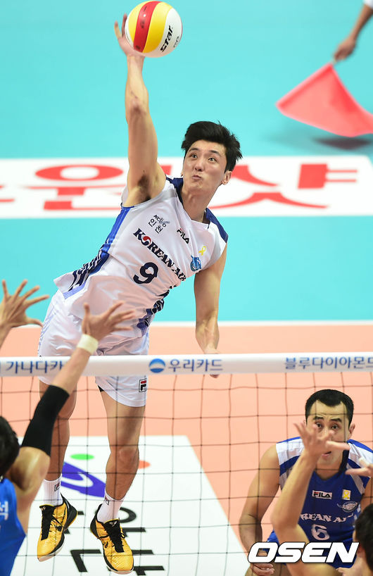 27일 오후 경기도 안산시 상록수체육관에서 진행된 '2014 우리카드컵 프로배구대회'(이하 코보컵) 남자부 결승 대한항공과 우리카드의 경기, 1세트 대한항공 곽승석이 스파이크를 시도하고 있다.
