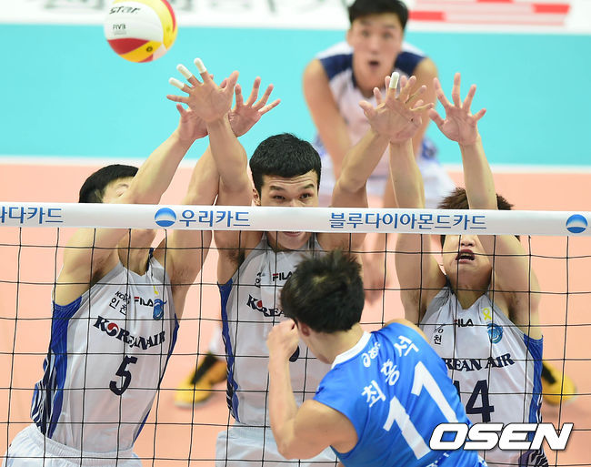 27일 오후 경기도 안산시 상록수체육관에서 진행된 '2014 우리카드컵 프로배구대회'(이하 코보컵) 남자부 결승 대한항공과 우리카드의 경기, 1세트 우리카드 최홍석의 스파이크가 블로킹을 넘기고 있다.