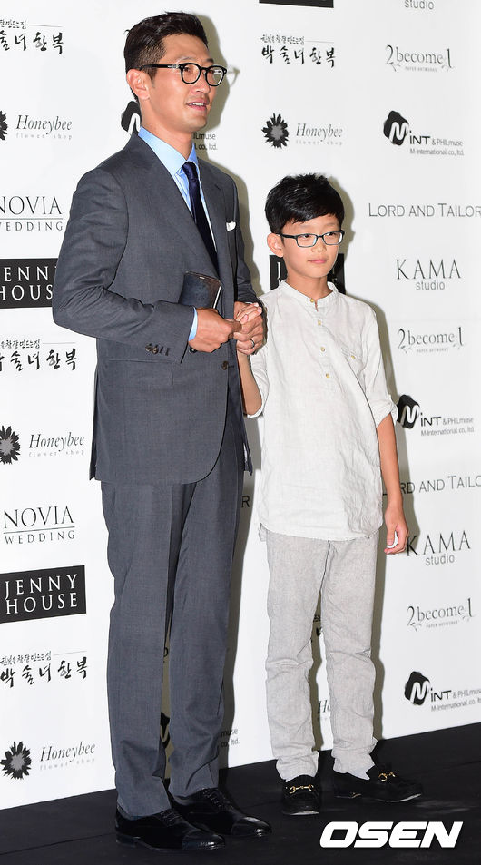 가수 김창렬과 아들 주환 군이 27일 오후 서울 광장동 쉐라톤 그랜드 워커힐 호텔에서 열리는 박지성-김민지 결혼식에 참석해 포토타임을 갖고 있다.