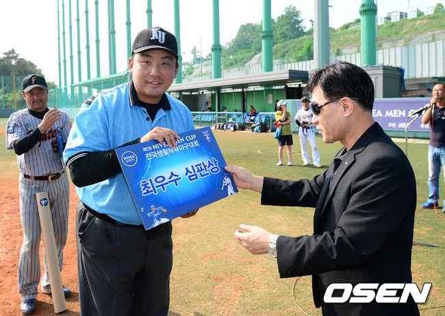 정내원 심판원이 국민생활체육 전국야구연합회 김광복 사무처장에 심판상을 건네받고 있다./ jpnews@osen.co.kr