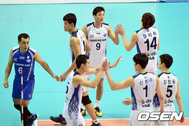 27일 오후 경기도 안산시 상록수체육관에서 진행된 '2014 우리카드컵 프로배구대회'(이하 코보컵) 남자부 결승 대한항공과 우리카드의 경기, 1세트 승리를 챙긴 대한항공 선수들이 기쁨을 나누고 있다.