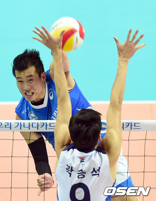 27일 오후 경기도 안산시 상록수체육관에서 진행된 '2014 우리카드컵 프로배구대회'(이하 코보컵) 남자부 결승 대한항공과 우리카드의 경기, 2세트 우리카드 김정환이 스파이크를 시도하고 있다.