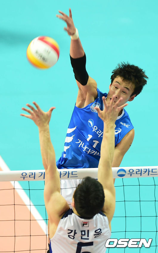 27일 오후 경기도 안산시 상록수체육관에서 진행된 '2014 우리카드컵 프로배구대회'(이하 코보컵) 남자부 결승 대한항공과 우리카드의 경기, 2세트 우리카드 최홍석이 스파이크를 시도하고 있다.