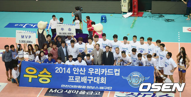 대한항공은 27일 안산상록수체육관에서 열린 2014 안산·우리카드컵 프로배구대회(KOVO컵) 남자부 결승전에서 우리카드를 세트 스코어 3-0(25-22, 25-19, 25-22)로 완파하고 2011년 이후 3년 만에 컵대회 정상에 섰다. 컵대회 1승이 목표였다던 김종민 감독은 대한항공 사령탑 부임 이후 첫 우승에 성공했다.
