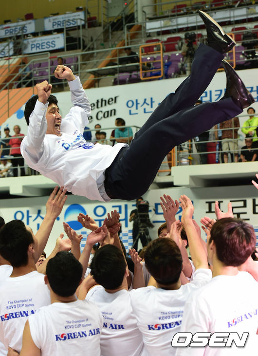 경기종료후 우승을 차지한 대한항공 선수들이 김종민 감독을 헹가래 치고 있다./greenfield@osen.co.kr