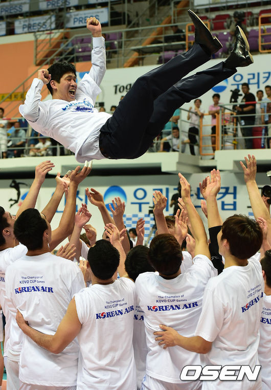 대한항공은 27일 안산상록수체육관에서 열린 2014 안산·우리카드컵 프로배구대회(KOVO컵) 남자부 결승전에서 우리카드를 세트 스코어 3-0(25-22, 25-19, 25-22)로 완파하고 2011년 이후 3년 만에 컵대회 정상에 섰다. 컵대회 1승이 목표였다던 김종민 감독은 대한항공 사령탑 부임 이후 첫 우승에 성공했다.