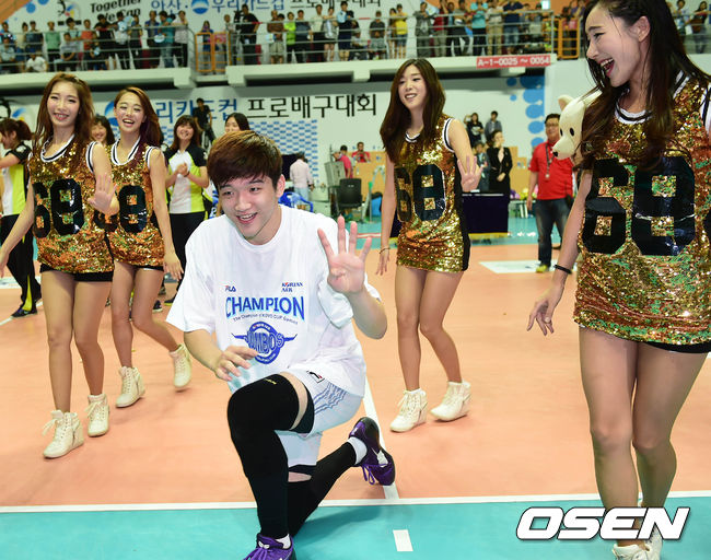 경기종료후 대한항공 정지석 선수가 우승 공약을 지키기 위해 치어리더와 함께 가수 선미의 보름달 댄스를 추고 있다./greenfield@osen.co.kr