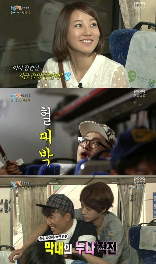 27일 오후 6시 방송된 KBS 2TV '해피선데이-1박 2일 시즌3'에는 기차 여행 중 빈 옆자리에 낯선 미녀가 앉는 모습이 담겼다.