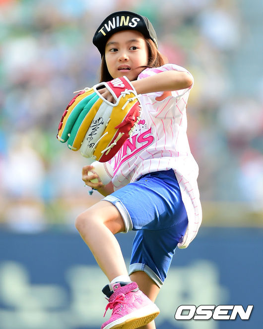 경기에 앞서 아역배우 갈소원이 시구를 하고 있다.