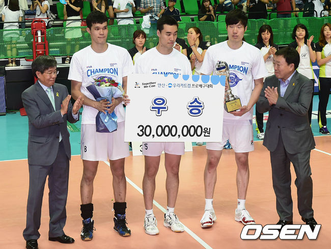 경기종료후 남자부 우승팀 대한항공 선수들이 트로피와 상금을 수여 받고 기념촬영을 하고 있다./greenfield@osen.co.kr