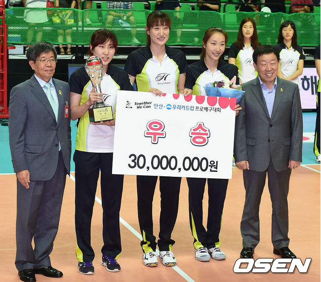 경기종료후 여자부 우승팀 현대건설 선수들이 트로피와 상금을 수여 받고 기념 촬영을 하고 있다./greenfield@osen.co.kr
