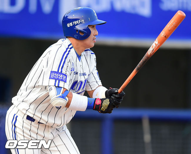 27일 오후 포항 야구장에서 열린 '2014 한국야쿠르트 세븐 프로야구' 삼성 라이온즈와 NC 다이노스의 경기, 2회말 삼성 선두타자 이승엽이 12년 연속 세자리 안타에 성공하고 있다.(프로통산 3번째)