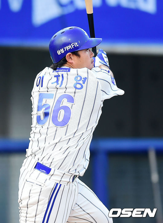 27일 오후 포항 야구장에서 열린 '2014 한국야쿠르트 세븐 프로야구' 삼성 라이온즈와 NC 다이노스의 경기, 2회말 1사 주자 1,3루 삼성 이지영이 중견수 앞 선취 1타점 적시타를 날리고 있다.